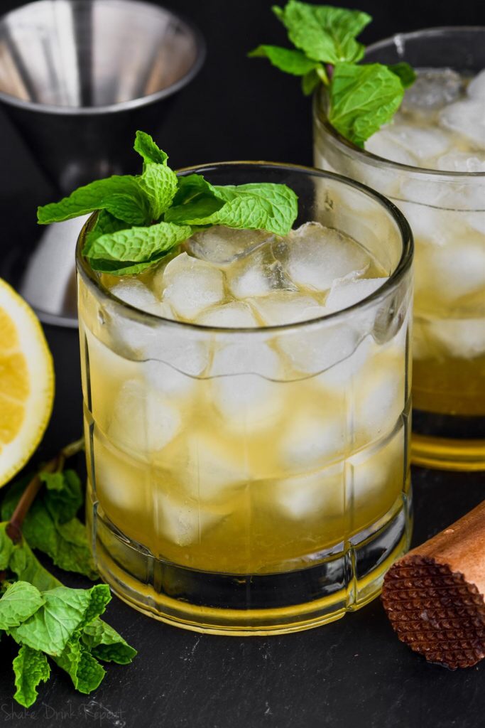 In a shaker add 3-4 pieces of a chopped lemon slice. Add mint leaves (8-10). Muddle these together then add simple syrup (1/2 to 3/4 oz) and 2oz of either rye or bourbon. Add ice, shake, pour through a strainer. Enjoy!