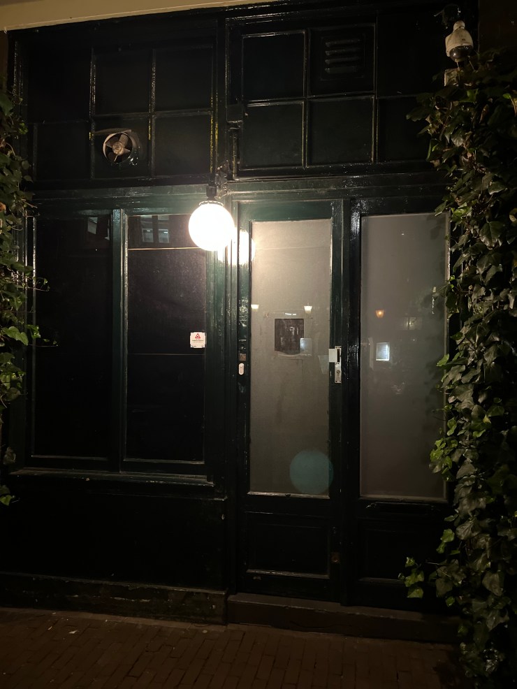 The evening was getting late and we were walking the streets of Amsterdam. Having done my research I was on a mission to find one of the city’s oldest, and most secretive speakeasy bars: Door 74. Having found the right street, Reguliersdwarsstraat, I found plenty of bars and restaurants, but couldn’t find our destination. Finally I started looking at the addresses, 72 Reguliersdwarsstraat, 73, 75, 76… aha! 74 was missing. In its place was this dark green door with blacked out windows. A single white light dimly illuminated the entrance.